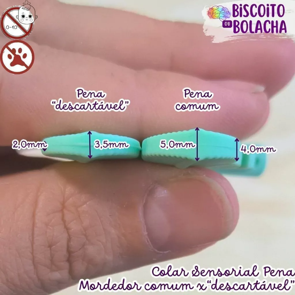 ATENÇÃO: Ao perceber desgaste do pingente, como pedaços soltando, SUBSTITUA O PRODUTO. Manter o produto deteriorado como mordedor pode causar ingestão das partículas, o que é prejudicial à saúde. Aqui proporcionamos maior acessibilidade aos colares sensoriais justamente pensando no seu uso contínuo - e necessidade de reposição.