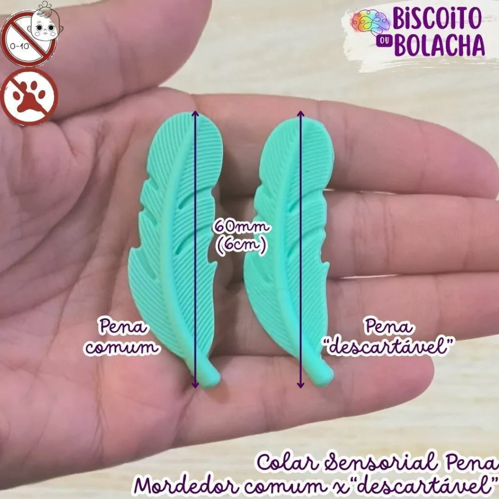 O pingente modelo PENA tem uma superfície com texturas muito suaves, e pouca rigidez - é um pingente bem macio e super flexível - e é um dos colares sensoriais que mais temos variação de cores (aliás somos a loja com a maior variedade de cores para colares sensoriais no Brasil) no formato de Pena tradicional.